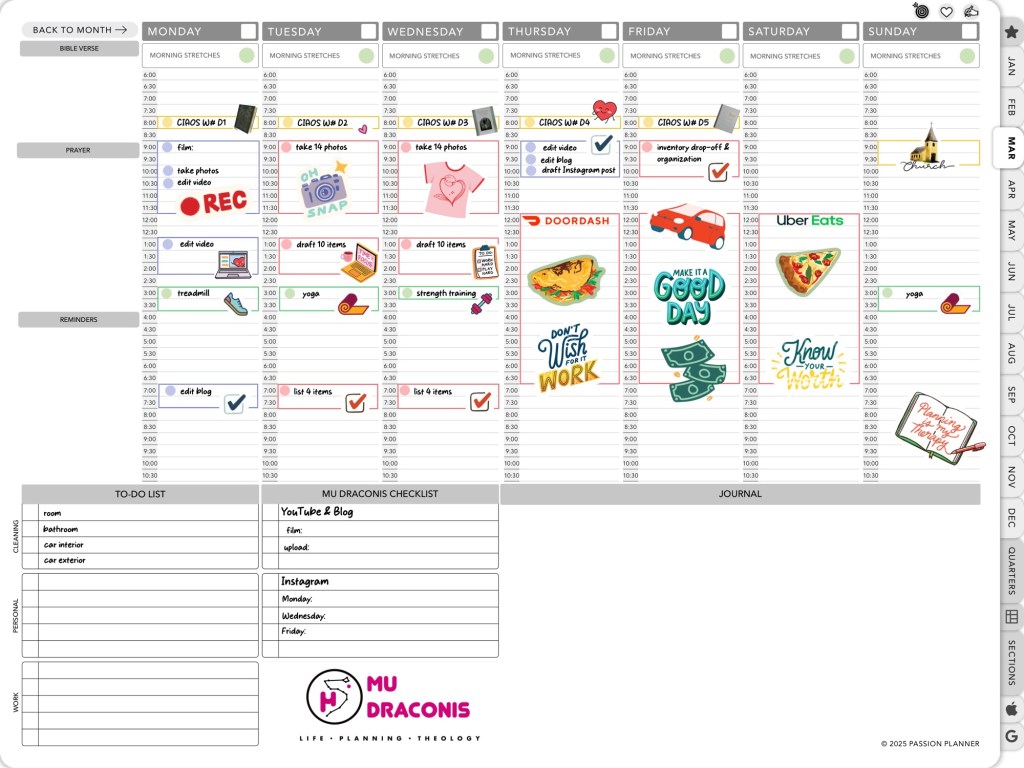 I’m making some changes to how I plan. I was using only the daily pages and then decided to go back to weekly planning only. I really didn’t need the daily pages and it was starting to become tedious, looking at and planning each day. So I created this template that I can use each week. Initially I was going to keep the layout simple and functional but I had fun adding the decorative stickers. It gives a nice touch of encouragement.